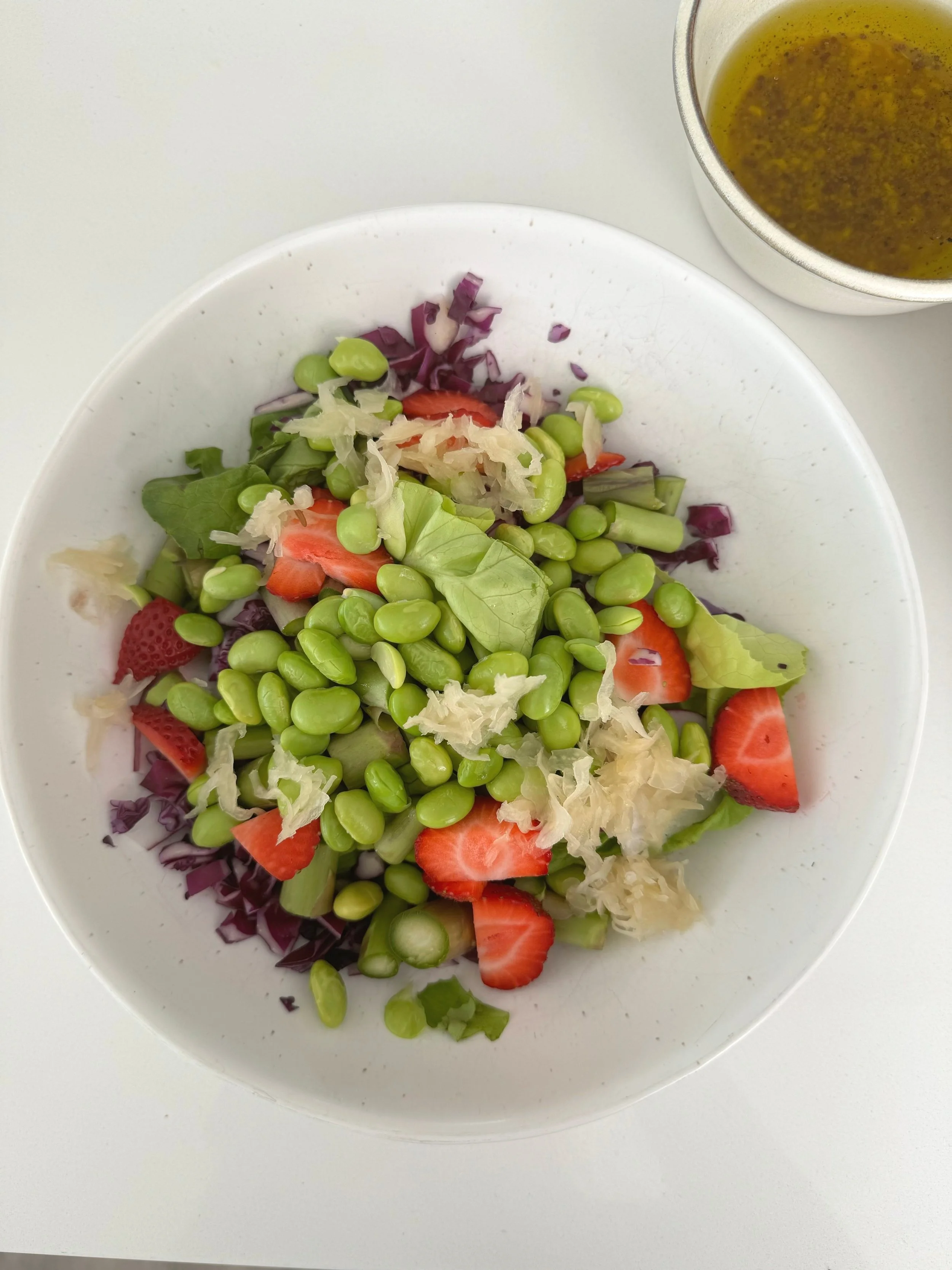 I include raw cabbage and asparagus here and my gut love this. Make sure you chew well and it you’re prone to bloating high FODMAP or raw foods may not be ideal for you. It’s summer, so I eat a lot more raw food than I would in the cold winter months in Canada.